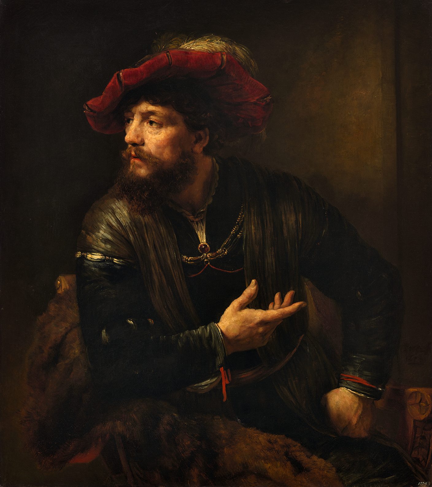 Rarely do artists capture the emotional energy that Drost achieves in this compelling image. The bearded man’s forceful pose commands the viewer’s attention. As he leans forward, gazing intently to the side, he gestures with an open hand in the opposite direction. He appears poised to speak—but to whom and why we do not know. The intensity also stems from Drost’s vigorous brushwork, his mastery of light, and his dramatic use of color in modelling the brilliant red, feathered beret, echoing scholar Jonathan Bikker’s broader insight about the artist’s concomitant filiation with, and distinctiveness from, Rembrandt: “In Man with a Plumed Red Beret, Drost demonstrates a command of the ‘rough manner’ that is indistinguishable from Rembrandt’s own work of the mid-1650s, yet he maintains a distinct, cooler emotional distance that is uniquely his own.” The sitter’s fanciful wardrobe, which is unrelated to seventeenth-century Dutch dress, identifies the work as a tronie—indeed the largest group of extant Rembrandtesque paintings by Drost are his tronies.