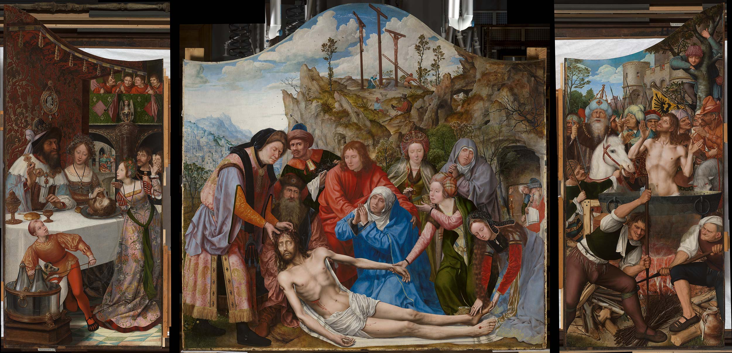 Photo montage showing all three restored panels of the Altarpiece of the Joiners’ Guild.
