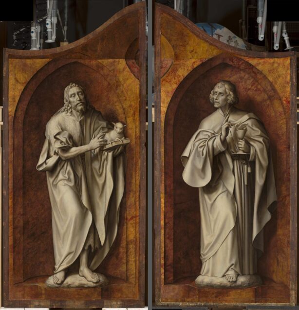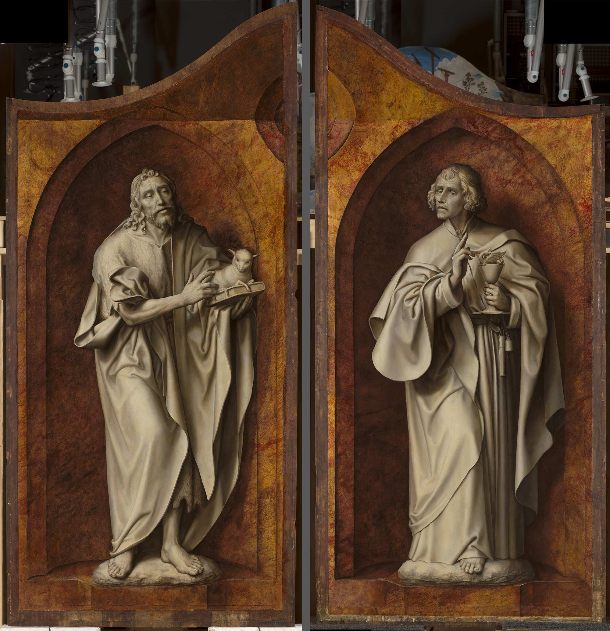Reverse of the outer panels showing monumental grisailles of patron saints John the Baptist and John the Evangelist.
