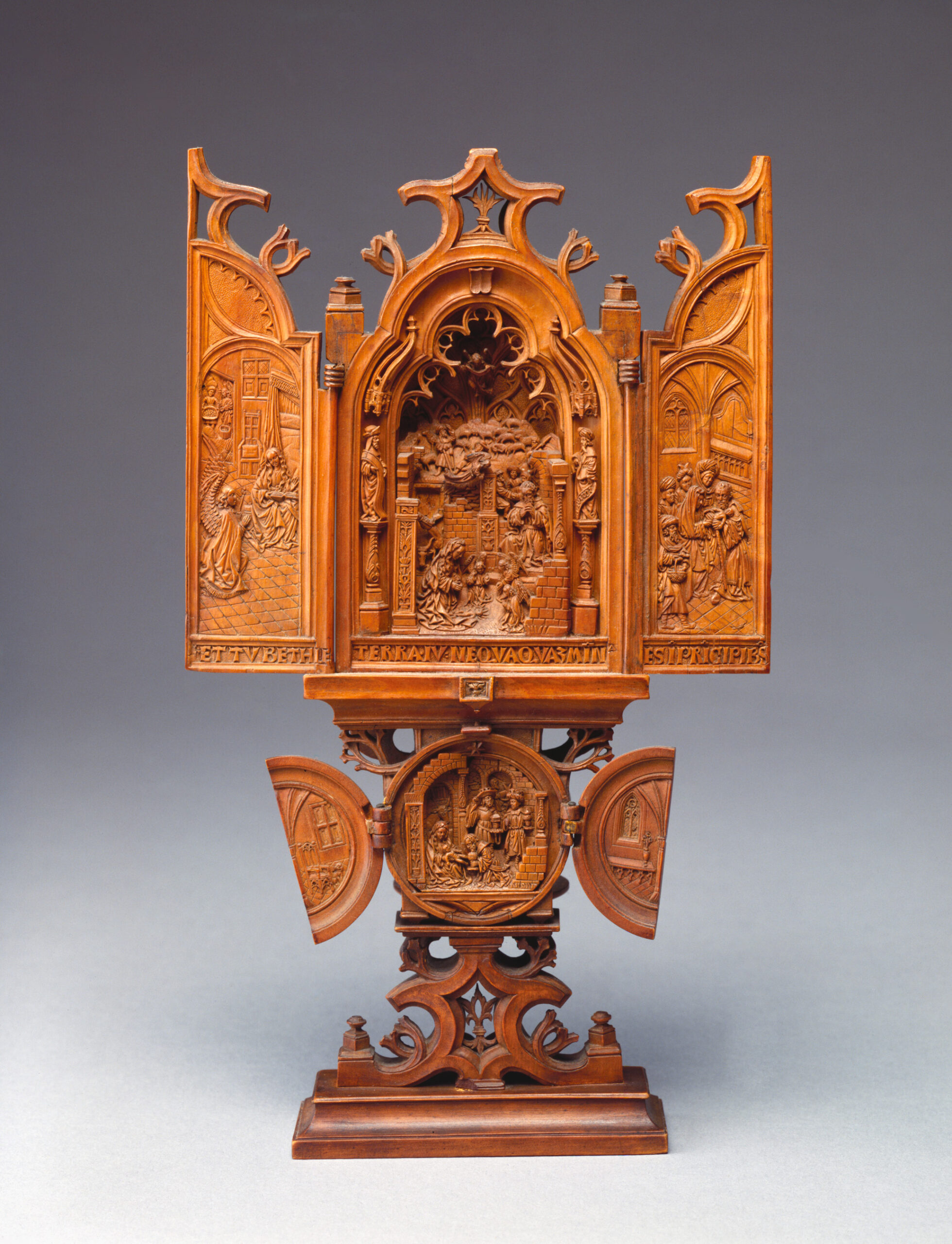 By contrast, an exquisite boxwood miniature Triptych (ca. 1520) (fig. 2), acquired in 1979 from the distinguished collection of Ernest Brummer, exemplifies the late medieval tradition of microscopic boxwood carving for which the Duchy of Brabant served as a major center. This tour de force of carving is only nine inches high, including its base. The central portion combines a Nativity scene with an Annunciation to the Shepherds, while the left shutter shows an Annunciation, and the right, a Presentation in the Temple. An Adoration of the Magi is carved in high relief in the foot below. Together, the Arenberg pieces and the Triptych testify to the extraordinary heights of virtuosity attained by Brabantine artists working in wood.