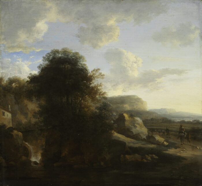 Today, the collection of Dutch and Flemish landscape paintings from the late sixteenth to early eighteenth centuries numbers 231 works by approximately 100 artists. Almost 190 of these were made by artists from the Northern Netherlands, the rest being of Southern Netherlandish origin. Salomon van Ruysdael is the artist best represented, with 10 paintings (fig. 1). He is followed by Aert van der Neer (6 paintings), Hendrick Mommers and Cornelis Gerritsz Decker (5), and Frederick de Moucheron, Allaert van Everdingen, Theobald Michau, Simon de Vlieger, Jacob van Ruisdael, and Jan van Goyen (4). Besides those already listed, the collection also holds artworks by the other major masters: Jan Breughel (I), Aelbert Cuyp, Meindert Hobbema, Hendrick Avercamp, Nicolaes Berchem, and Philips Wouwerman. In addition, it has important pieces by lesser-known painters, some of which are key to forming an idea of these masters’ oeuvres. This applies, for instance, to Abraham de Cooge, whose Italianate Landscape is the only extant signed piece by his hand (fig. 2). Also noteworthy are the rare pair of signed Menageries by Nicolaes de Vree, four works by Jan van Ossenbeeck that provide a representative overview of his output, a View of Cologne that was attributed to Jan de Vos (II) by former RKD director Sturla Gudlaugsson, and a river landscape bearing a CH monogram which Marijke de Kinkelder recognized as a work by Claes Hals.