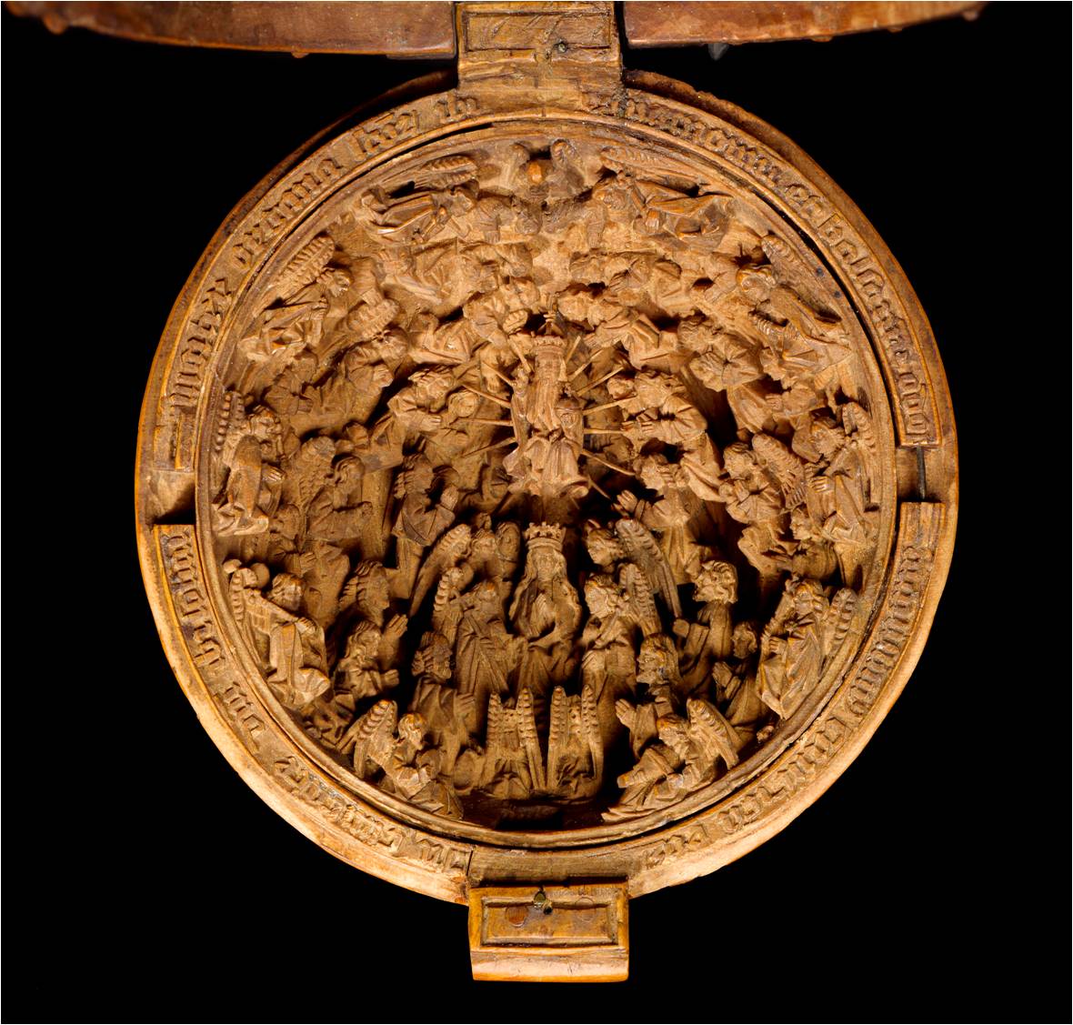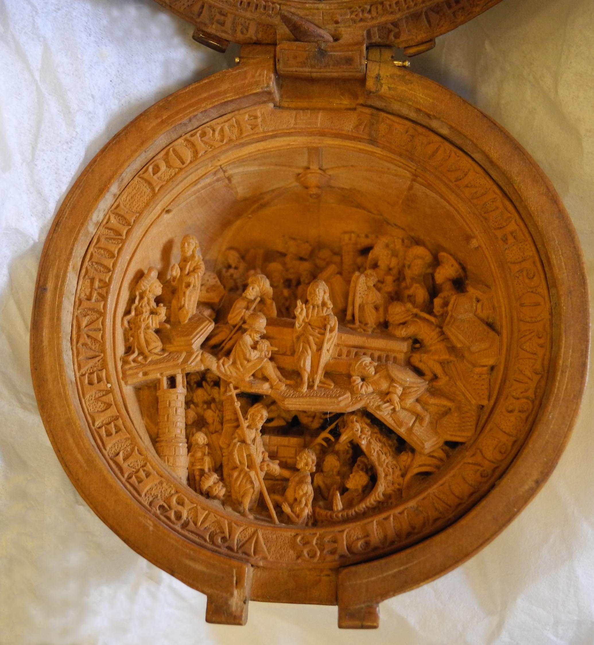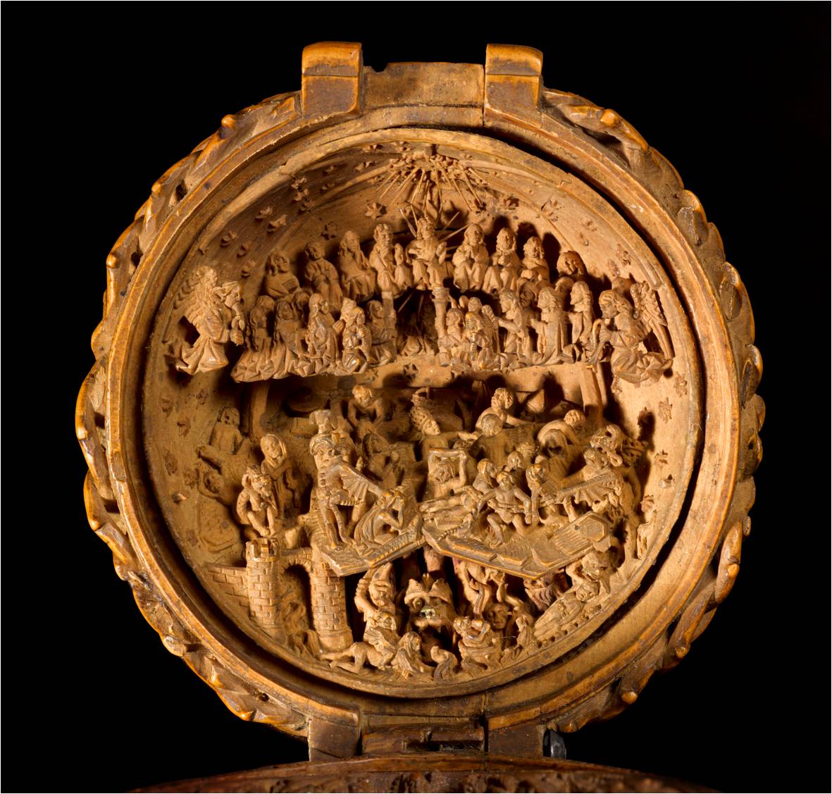 The intricately carved spherical bead has a wonderfully pierced Gothic tracery exterior and measures 6.1cm in diameter closed. When opened, interior carved hemispheres are nestled within the exterior shell where they were originally held in place with wooden pegs alone. Each interior hemisphere measures approximately 5.7 cm in diameter with a depth of approximately 3.2 cm. X-radiography and Micro-CT scanning revealed a number of clever strategies used by the sculptor to confound the viewer’s attempt to understand how the object was made. It appears that each interior hemisphere started as a solid wooden mass which was carved from the front flat plane but which contains “windows” or portions of the exterior which were removed to allow access into the deeper portions of the hemisphere from behind. The “windows” were then replaced in such a way as to be invisible to the viewer when seen from the front. There are a variety of traditional joining techniques employed in the construction of the interior hemispheres including tongue and groove joints, rabbets and butt joints secured with pegs which are held in place occasionally with what appears to be original adhesive. The precise number of carved elements used to depict the Last Judgement is not yet known. However, close to thirty separately carved, delicate spikes were set into the ceiling boss in the uppermost portion of the scene as well as set around the enthroned Christ figure. The rest of the scene appears to have been constructed out of multiple pieces carved from a single piece of boxwood and then fitted back together so that the original wood grain remained intact. The artist who made this bead had its survival in mind – by lining up the original wood grain the bead acts like a solid piece and is much less likely to sustain damage through expansion and contraction.
