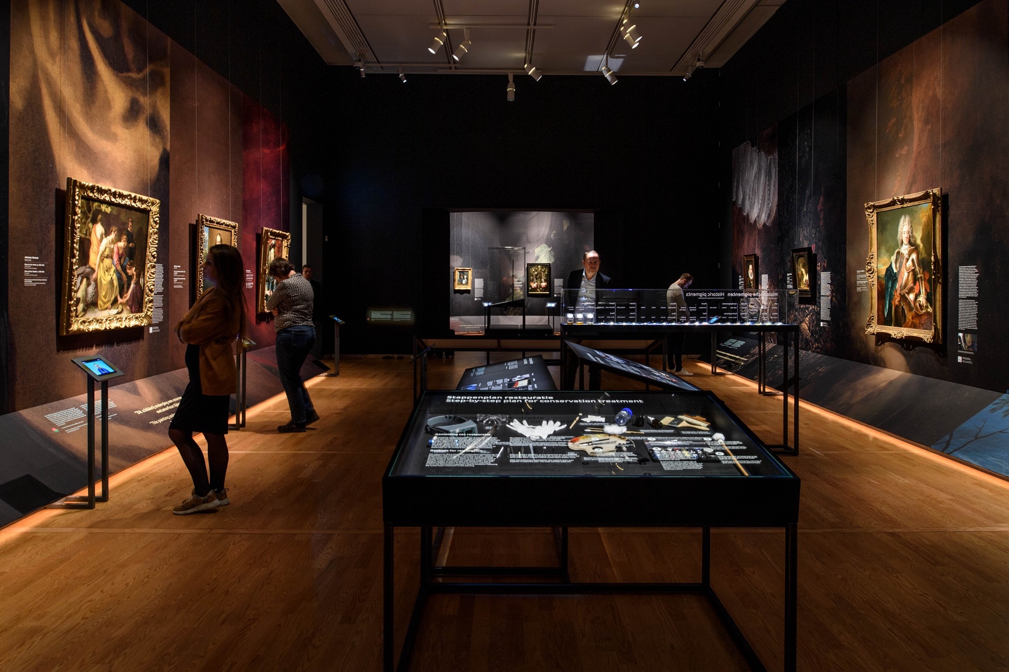 That said, most restorations still take place behind the scenes in our conservation studio, which is not open to the public. Over the years, multiple new insights and discoveries were shared in our field, either in publications or at conferences, and it was time to share them with our visitors as well. I was therefore very keen to put on an exhibition. I curated the resulting show, in the marvelous design by Lies Willers (fig. 7), with my colleague, conservator Sabrina Meloni. After lengthy preliminary discussions with the other conservators, we eventually selected 20 case studies of restored paintings, from famous seventeenth-century masters like Vermeer, Rembrandt, Hals, and Potter to lesser-known artists such as Abraham Govaerts and the sixteenth-century portraitist Adriaen Key.