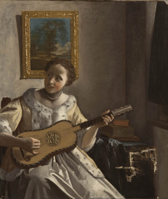 The Guitar Player (1672) by Vermeer is an exquisite work of art, perfectly capturing a single moment in time. It is one of only 37 known paintings by Vermeer, an artist who specialized in depicting everyday life in domestic interiors. In this painting, a young woman looks up while playing her guitar, as the strings continue to vibrate. Today, Vermeer is considered one of the greatest painters of the Dutch Golden Age, and the rarity of his work has only increased his status. Across the Atlantic, however, in the Philadelphia Museum of Art, there is another remarkable painting, a near doppelgänger to The Guitar Player. Painted on similar-sized canvases, the paintings depict the same scene, a young woman with her guitar, but there are a number of differences; the main being that Kenwood’s sitter has her hair in ringlets, while Philadelphia’s does not and, perhaps most significantly, Kenwood’s painting is signed by the artist, while Philadelphia’s version is not. Originally thought to be a Vermeer, and then assumed to be a copy, the origins of the Philadelphia painting have been unclear.