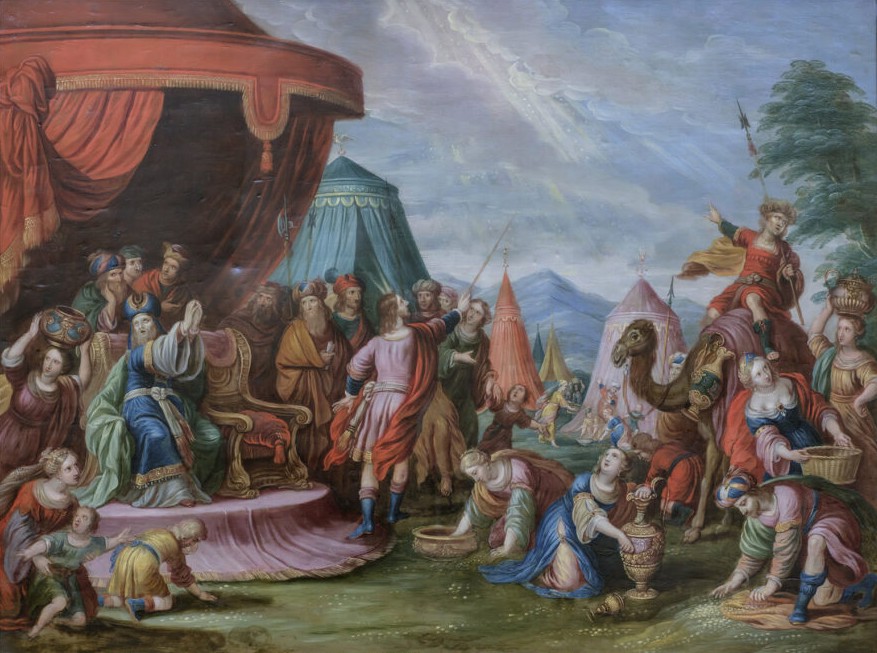 The display is structured to lead exhibition visitors through a chronological reading of the bible. One section focuses on the Old Testament, featuring scenes such as The Meeting of Rebecca and Eliezer at the Well and The Brazen Serpent. Many of these works are inspired by the compositions of Frans Francken II, a central figure in the development of Flemish cabinet painting. The New Testament cycle includes eleven works depicting the life of Christ, which demonstrate the pervasive influence of Peter Paul Rubens and Anthony van Dyck. For instance, the compositions of The Visitation and The Presentation in the Temple follow models established by Rubens, mediated through engravings by Pieter de Jode II and Paul Pontius.