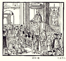 | Jan Dunselman, Petrus Canisius geeft onderricht aan kinderen, Amsterdam 1928, Museum Amstelkring Ons ‘Lieve heer op zolder | Catechismusonderricht voor kinderen in de kerk, houtsnede, in: Georg Scherer, Catechismus oder Kinderlehr II, Bruck, 1600 |