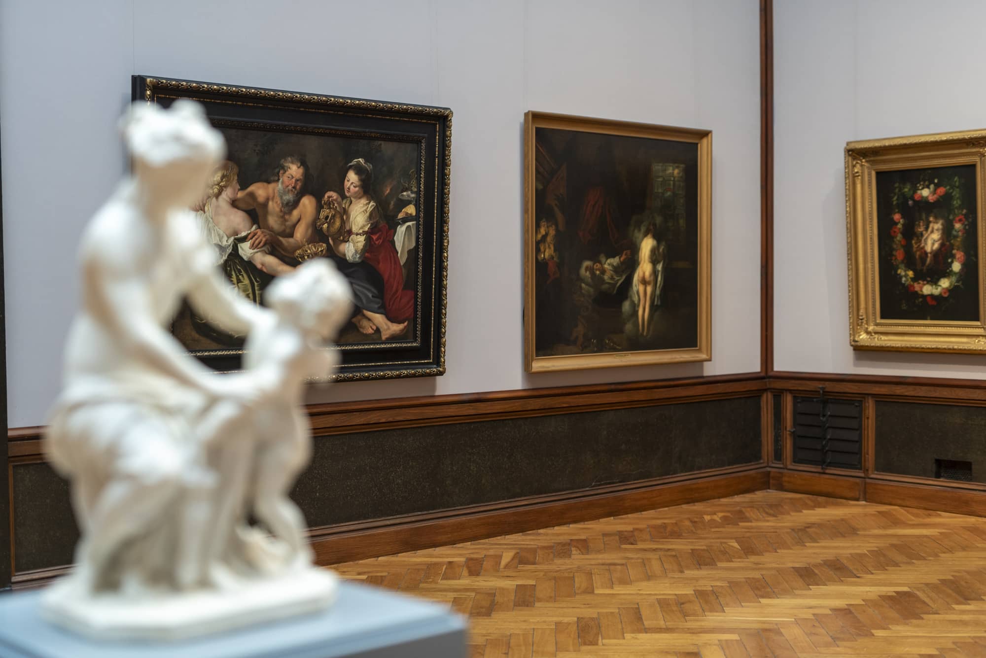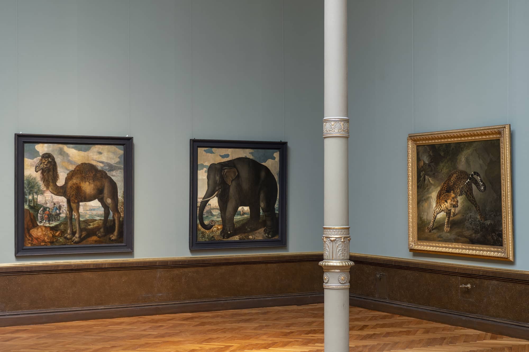 The first-floor galleries, which chiefly house old master paintings, remain mostly unaltered aside from the addition of a badly needed new lighting system. This new arrangement displays the permanent collection and will be reconfigured periodically. In addition to the signature Dutch and Flemish paintings, which include the Christoph Müller collection, the museum currently shows part of its holdings of German sixteenth-century art, with several paintings by Lucas Cranach the Elder as well as some sculpture. Furthermore, there is a small presentation on women artists. In a notable arrangement, Jean-Baptiste Oudry’s menagerie, including the life-size rhinoceros Clara, is now confronted with the large animals by Maerten de Vos, which were painted in 1572 for Schwerin. The series of ten panels was originally inserted into the walls of a room in the castle. Only six are extant today, and Schwerin holds and shows four of them: an elephant, a camel, a leopard, and a unicorn (the last of which is on loan to the Barberini Museum until February 2026).