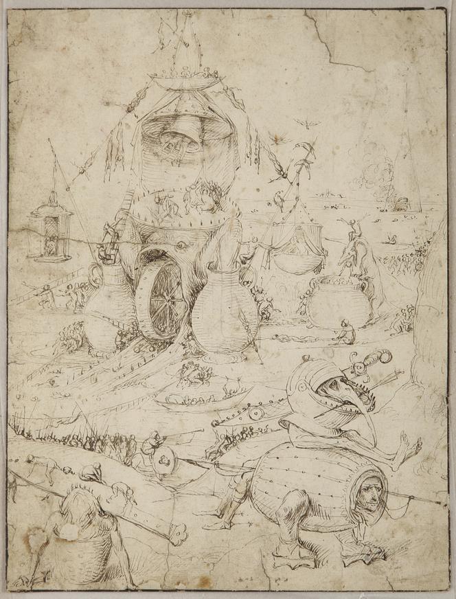 The quality of the drawing as a whole and the many distinctive details, for instance the figure with the helmet sitting on a barrel with legs, with in it another human figure, is nothing less than magnificent. The drawing gives us a fascinating insight into the methodology that Bosch used to compose images, namely very associative and additive. The artist created his own fantasy world, which he was able to display on paper as a self-evident reality. Here he goes to work in exactly the same manner as with the arrangement of the hell panel of The Garden of Earthly Delights, probably the most famous scene from hell of Western art.