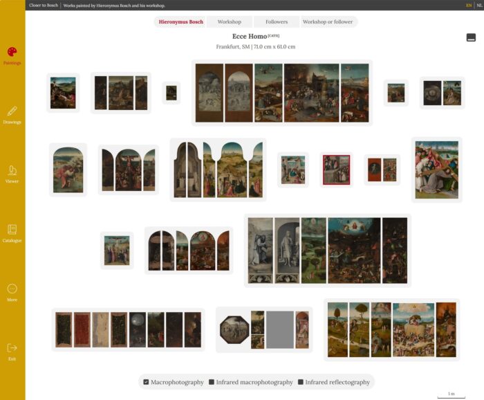 Utilizing extremely high resolutions, the site allows users to study and compare the paintings of Jheronimus Bosch, his workshop and followers in unprecedented detail. Users have access to various image types, including visible light and infrared light documentation. The imagery is complemented by scholarly texts drawn from the BRCP’s publications. Additional paintings and Bosch’s drawings will be integrated into the platform at a later date.